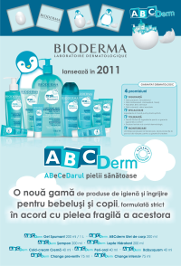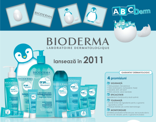 Laboratoarele Bioderma au adus experienta dermatologica in sprijinul pediatrilor prin formularea primei game de igiena si ingrijire pentru sugari si copii cu un nivel ridicat de siguranta si toleranta. Formularea stricta a gamei ABCDerm este in acord total cu fragilitatea pielii bebelusilor si respecta cele 4 promisiuni: